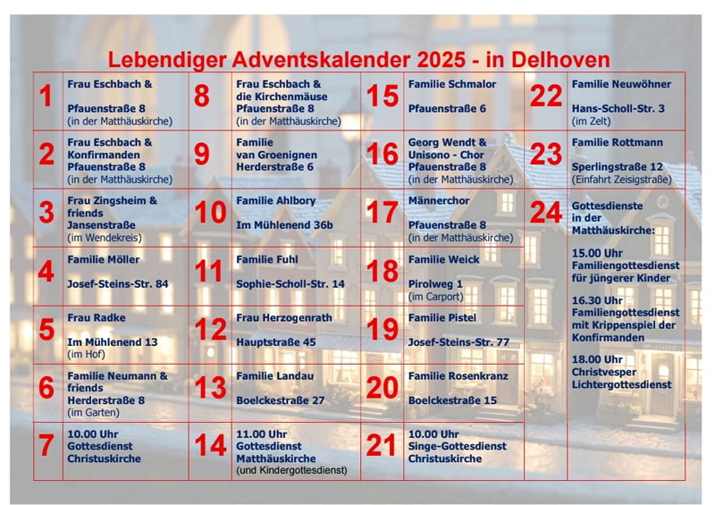 Den Advent bewusst zu erleben, Zeit miteinander zu verbringen und sich an die Botschaft der Weihnachtszeit zu erinnern – das ist das Ziel des erstmals in Delhoven initiierten lebendigen Adventskalenders. Vom 1. bis zum 24. Dezember sind Jung und Alt, Nachbarn und bis dahin Fremde eingeladen, von montags bis samstags zwischen 18 und 19 Uhr für eine „gute Stunde“ an wechselnden Orten – drinnen wie draußen – zusammenzukommen.Bei Spekulatius und Apfelpunsch werden Geschichten von Hirten und Sternen erzählt, es gibt kreative Mitmachangebote, traditionelle Adventsbräuche und neue Lieder. An den Adventssonntagen und am Heiligabend stimmen Gottesdienste auf Weihnachten ein.