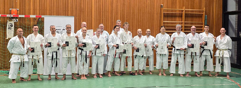 Erstmals führte der Verein zudem Dan-Prüfungen zum Schwarzgurt durch. Dieser Meistergrad gilt als besonderer Meilenstein im Karate. Unter Ausschluss der Öffentlichkeit stellten sich siebzehn Prüflinge den Anforderungen für den 1. bis 4. Dan.